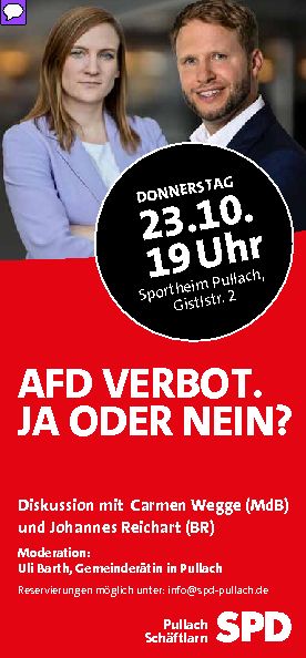 Die SPD Pullach veranstaltet eine Podiumsdiskussion zum Thema AFD Verbot mit MdB Carmen Wegge  und ...