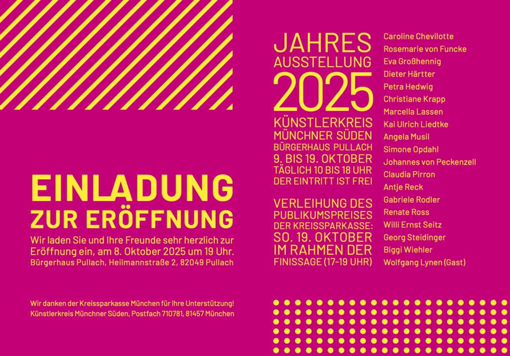 der Herbst ist eine wunderbare Zeit, um Neues zu entdecken – nicht nur in der Natur, sondern auch direkt vor unserer Haustür. Kürzlich hatte ich das Vergnügen, in Pullach den Künstler Georg Steidinger kennenzulernen. Im FAB am Kirchplatz zeigte er mir seine Werke und gab spannende Einblicke in seine kreative Welt. Er nimmt auch an der Ausstellung des Künstlerkreises München Süd teil – eine tolle Gelegenheit, lokale Künstlerinnen und Künstler kennenzulernen, ins Gespräch zu kommen und vielleicht das ein oder andere Lieblingsstück zu entdecken.
