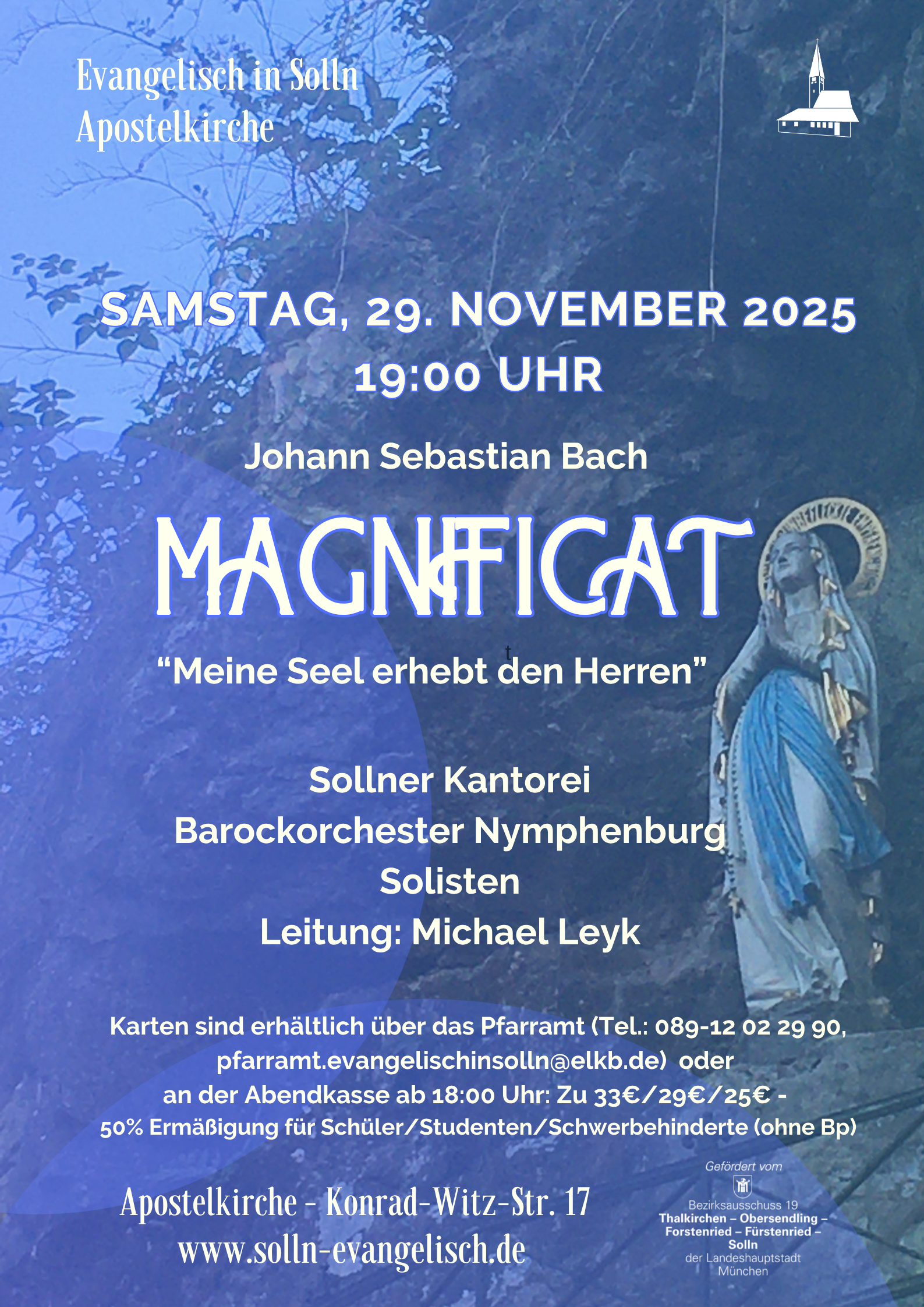 Am Vorabend des 1. Advent präsentiert die Sollner Kantorei unter der Leitung von Michael Leyk in der Apostelkirche mit diesem „alternativen Weihnachtsoratorium“ und der Bach-Kantate BWV 10 „Meine Seel erhebet den Herrn“ zwei Schätze der barocken Kirchenmusik.