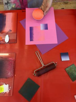 Durch Hochdrucktechniken werden typische Geiger-Farben auf farbige DIN A4-Papiere übertragen. Die Teilnehmer können eine Vielzahl an Motiven gestalten und somit auch den seriellen Charakter der Druckgrafik miteinbeziehen.