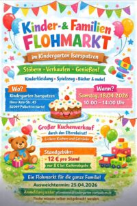 Kinder-& Familien FLOHMARKT im Kindergarten Isarspatzen Stöbern • Verkaufen • Genießen! Kinderkleidung • Spielzeug • Bücher & mehr! Kindergarten Isarspatzen Hans-Keis-Str. 45 82049 Pullach im Isartal Samstag, 18.04.2026 10:00 –