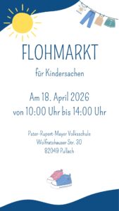 FLOHMARKT für Kindersachen Am 18. April 2026 von 10:00 Uhr bis 14:00 Uhr Pater-Rupert-Mayer Volksschule Woltratshauser Str. 30 82049 Pullach